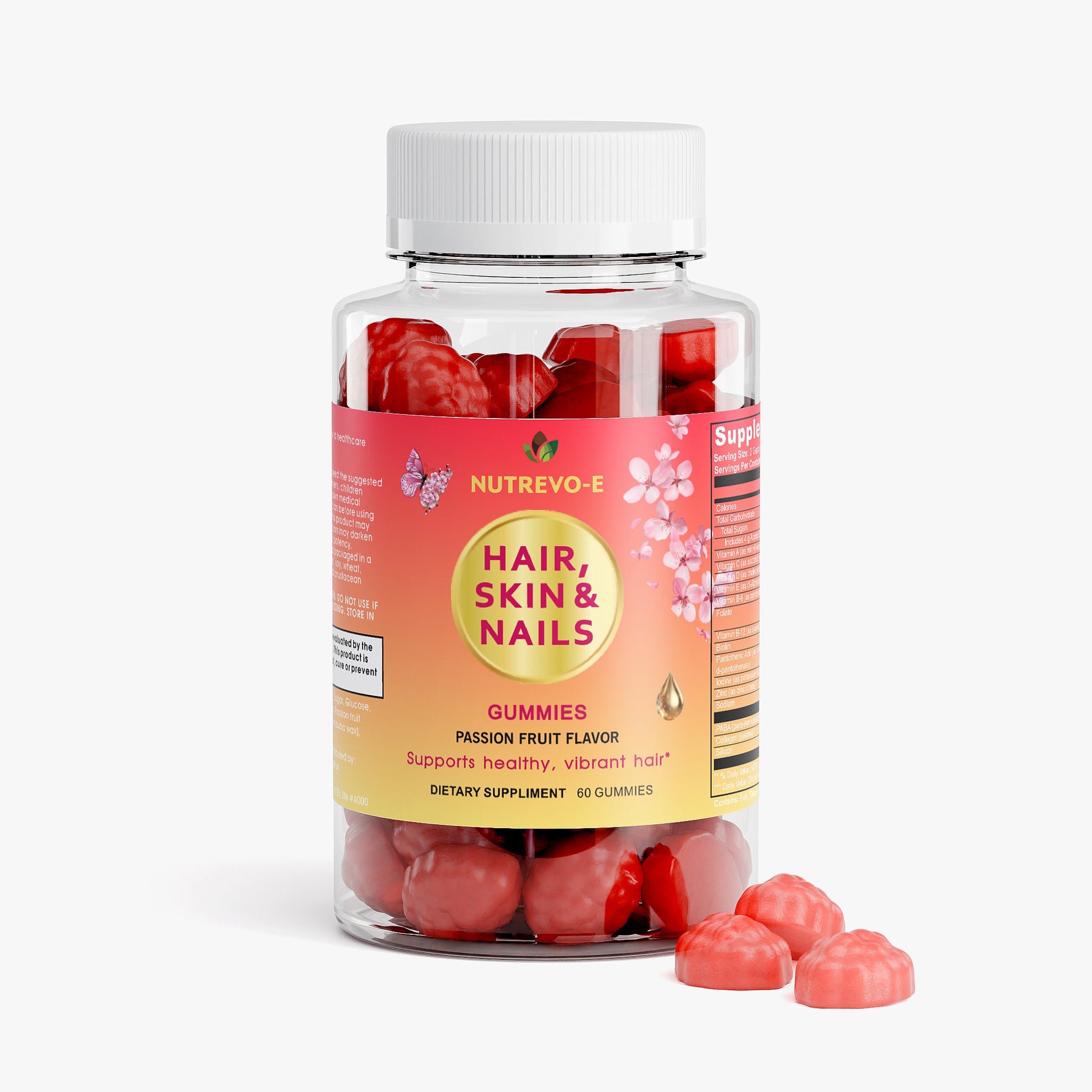 Ingredients: Vitamin A (as retinyl acetate), Vitamin C (as ascorbic acid), Vitamin D (as cholecalciferol), Vitamin E (as dl-Alpha tocopheryl acetate), Vitamin B-6 (as pyridoxine HCI), Folate, Vitamin B-12 (as cyanocobalamin), Biotin, Pantothenic Acid (as calcium d-pantothenate), Iodine (as potassium iodide), Zinc (as zinc citrate), PABA (para-Aminobenzoic Acid), Collagen (piscine), Silicon, Glucose syrup, Sugar, Glucose, Pectin, Citric acid, Sodium citrate, Passion fruit flavor, Vegetable oil (contains carnauba wax), Purple carrot juice concentrate.
